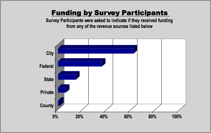 The chart on the left indicates that most — roughly 60 percent — of the surveyed programs receive funding from city sources, with about 30 percent receiving funding from the federal sources, 15 percent from state sources, and less than 10 percent form private sources.