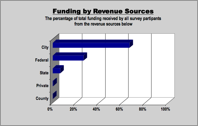 The chart on the right indicates that funding from city sources composes nearly two-thirds of the total revenue across all surveyed programs, with federal sources composing less than one-quarter of all revenue, state sources less than one-tenth, and private and county sources a negligible amount.