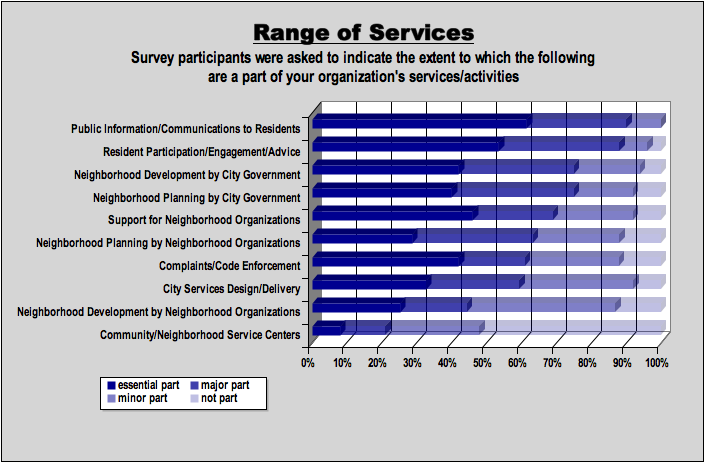 And, roughly 40 percent consider Neighborhood Development or Neighborhood Planning to be an essential element of their work, with 75 percent indicating that these services are at least a major part of their work.